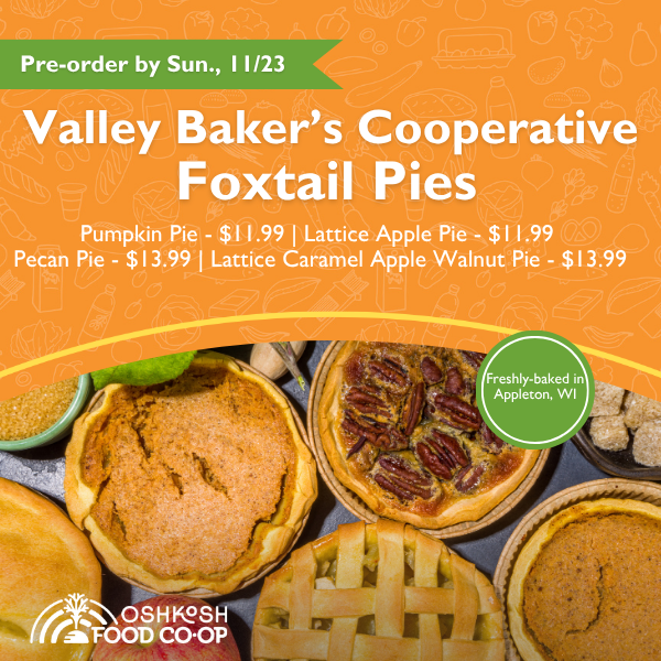 - Foxtail Pumpkin, Gourmet Lattice Apple, Pecan, and Gourgmet Lattice Caramel Apple Walnut Pies are sourced directly from Valley Bakers Cooperative, Appleton.