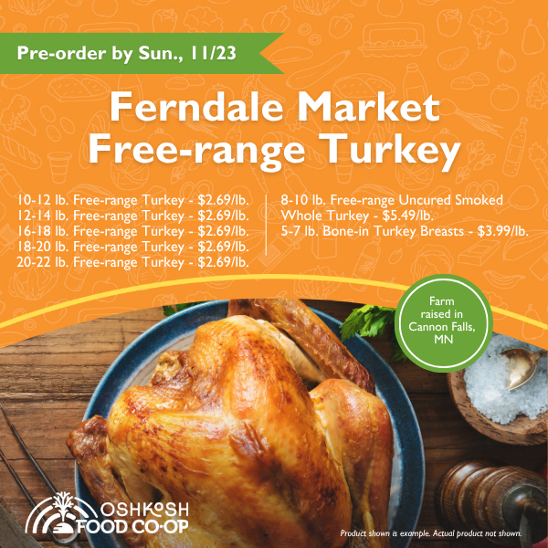 Ferndale Market is a third-generation family farm raising free-range turkeys without antibiotics. Each turkey is naturally processed, without fillers and nitrate additives. This year, your Co-op team has sourced three Ferndale Market turkey options for you: