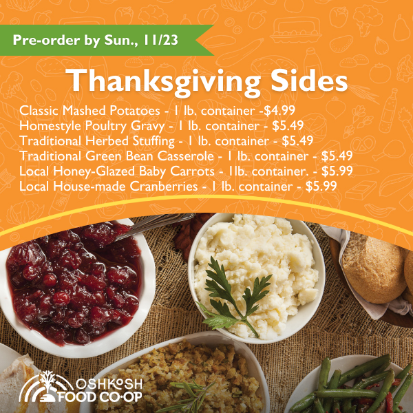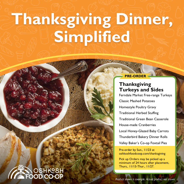 When you add locally sourced dishes to your Thanksgiving table, you're helping build a stronger local food economy. That's something we can all be grateful for. Happy Thanksgiving from all of us at the Oshkosh Food Co-op!